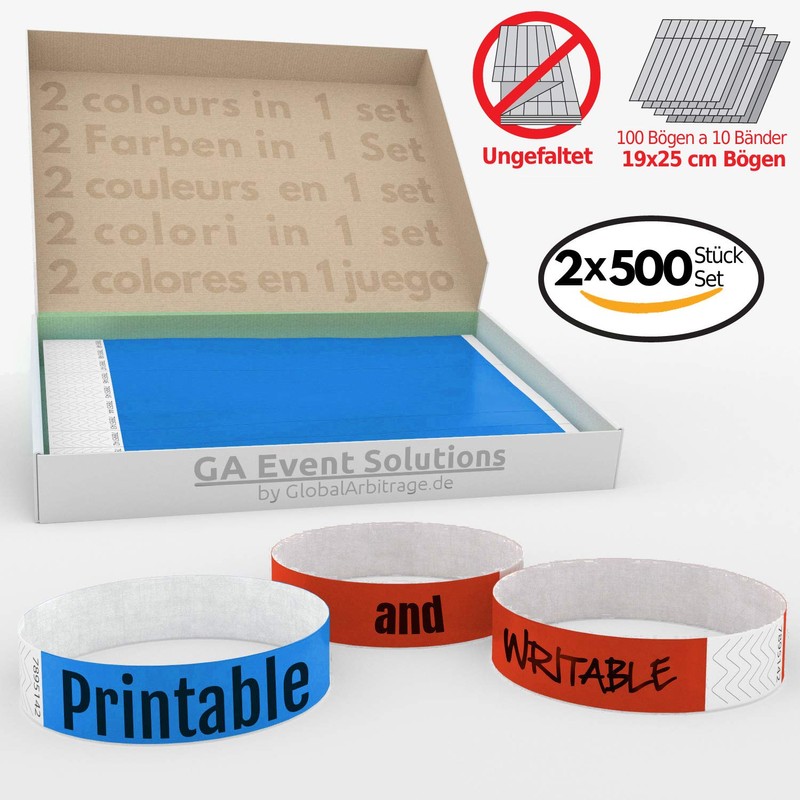 Red and Light Blue Value Pack: 2 x 500 Tyvek Entrance Wristbands to Design and Print Yourself by GA Event Solutions - Party Admission Bands, Festival Bracelets for Your Event