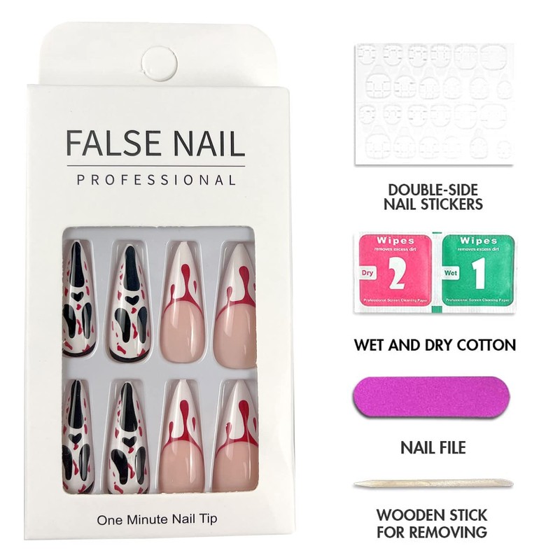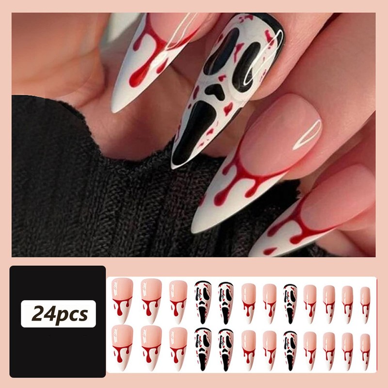 - 💅【Halloween Press on Nail 】You will get 24 pieces of almond Medium spooky press on nails for Halloween party decoration. The package contains 1pcs nail glue,24pcs nail adhesive tabs, 1pcs nail file, and 1pcs wooden stick.