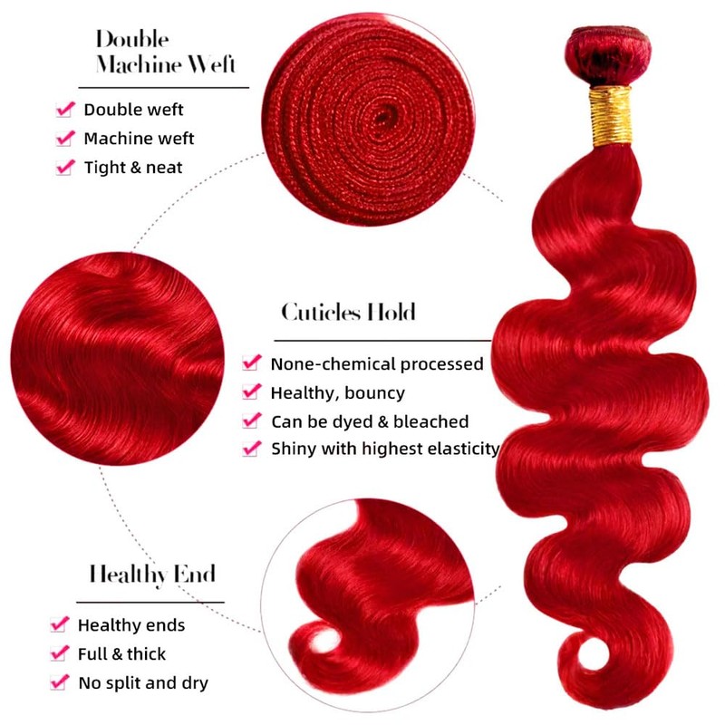 - Bundles Human Hair Color: Red Body Wave Human Hair Bundles, Can Be Straightened, Permed, Curled ,Dyed And Bleached.