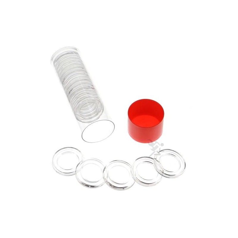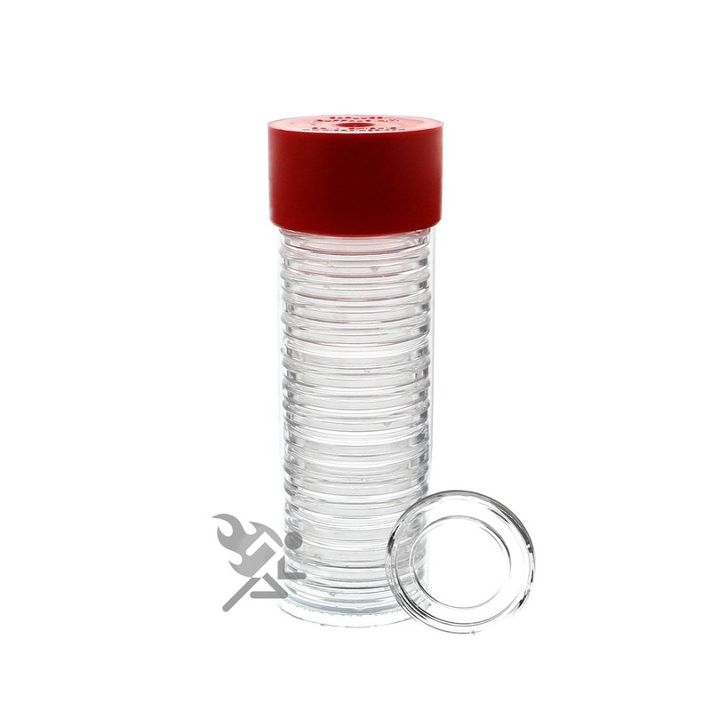 Each capsule tube is designed for storing coins encapsulated in Air-Tite brand coin capsules. Each capsule tube holds up to 20 completely closed coin capsules. Tubes are crystal clear and PVC free with a snug fitting cap. There is a small hole in the middle of the cap to allow air flow while opening/closing the tube. A welded bottom allows for a complete view of any enclosed capsules. Air-Tite coin capsule holders are made from acrylic plastic with a non-yellowing agent, a process that results in a final product that is hard, crystal clear, and smooth to the touch. The cover and base snap together firmly to form a perfect seal enclosing the ring and securing your collectible. Capsules are PVC free, archival safe, and suitable for extended periods of long term coin or bar storage. Coin capsules are securely packaged un-assembled within layers of foam to protect them during shipment. Coin capsules are made in the USA.