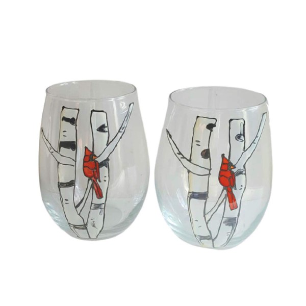 Red Cardinal Bird Birch Tree Hand Painted Stemless Wine Glasses Set 2