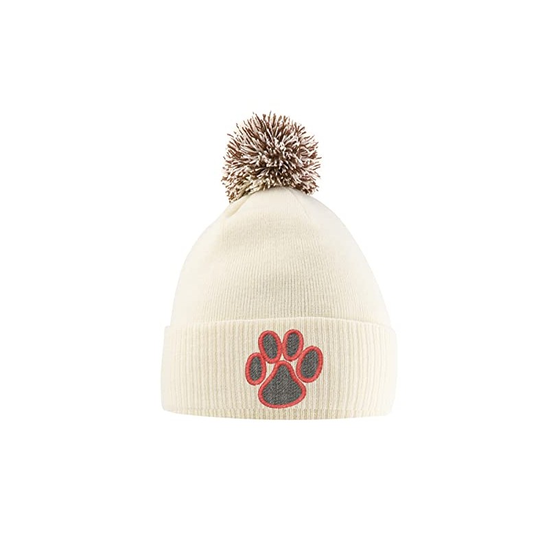 Red Cat Paw Print Hat - Bobble Beanie Hat - Cat Owner Gifts for Girls - Winter Beanie Hat with Cute Cat Design Embroidered On The Front, One Size, Off White/Mocha