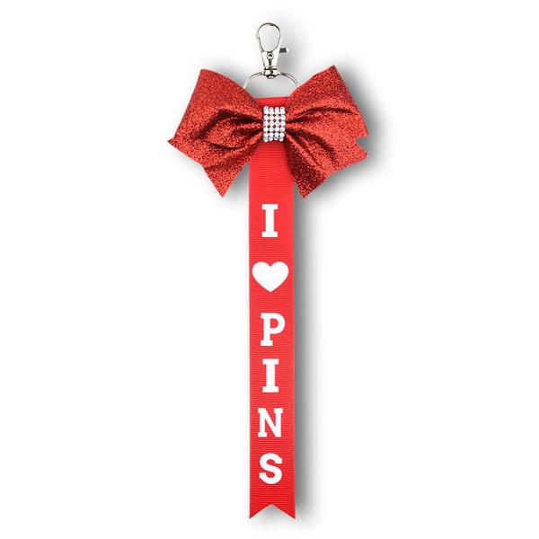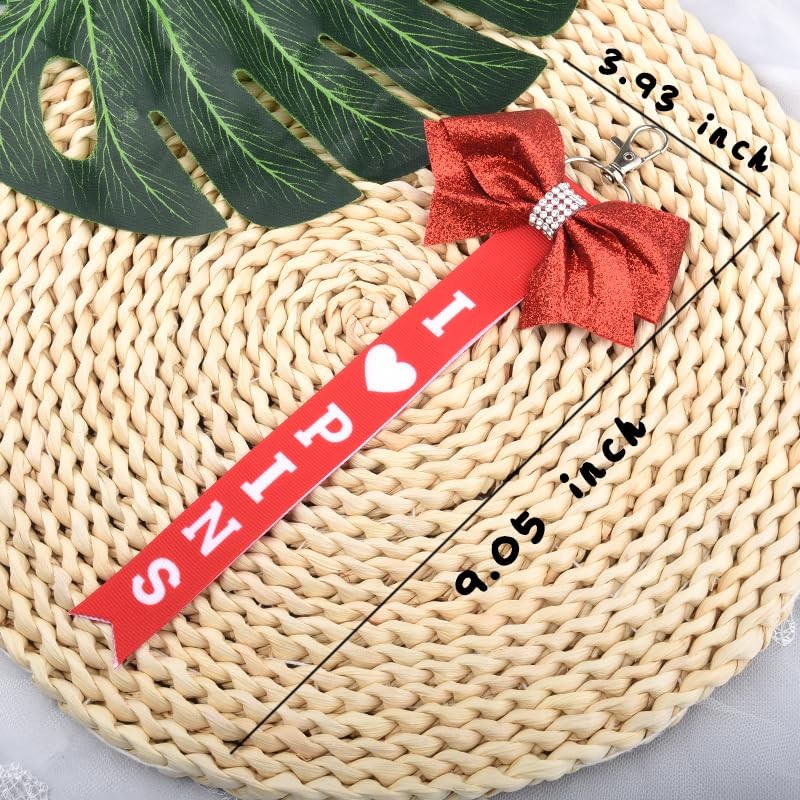 - Cheerleading Stuff for Cheerleader Cheer Team: The cheer bow key chain in the middle with rhinestone strips, which printed with i love pins, when you hang on the cheer bag, make your bag more beautiful and charming, shining brightly at all times, make you always maintain confidence and give you courage, red pin me ribbon for cheer bag backpack, cheer keychain accessories for girls women