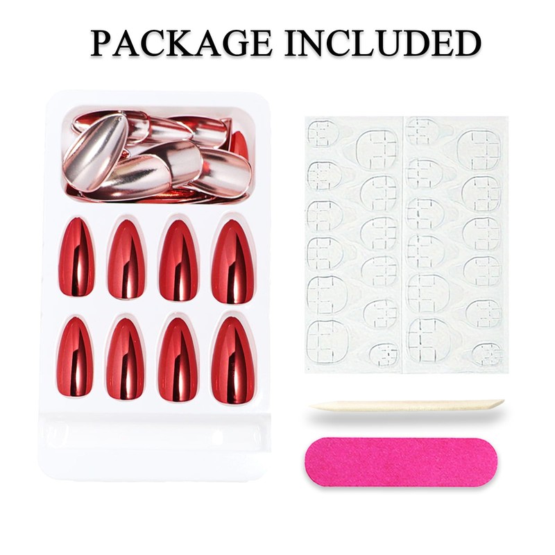 - Package Contents: You will get 24 medium almond press on nails, 24 jelly adhesive stickers, 1 nail file and 1 wooden stick. With this nail kit, you can easily apply glossy mirror false nails by yourself without going to a professional nail salon