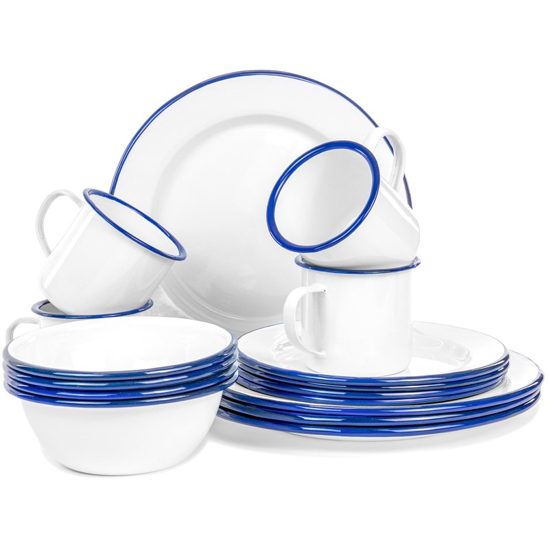 Red Co. 16-Piece Enamelware Metal Dinnerware Set for 4, Solid White/Navy Blue Rim