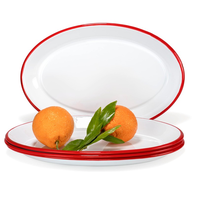 Red Co. Set of 4 Enamelware Metal Classic 13" Serving Oval Tray Platter, Solid White/Red Rim