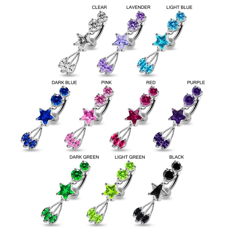 - Red CZ Crystal Stone Two Round with Star and Leaf Dangling Reverse Bar 925 Sterling Silver Silver with Stainless Steel Belly Button Ring Piercing Jewelry. Made from 925 Sterling Silver with Cubic Zirconia Gemstone and 316L Surgical Steel , this belly bar is the perfect piercing to wear everyday, a comfortable fit that will help give you that extra sparkle daily