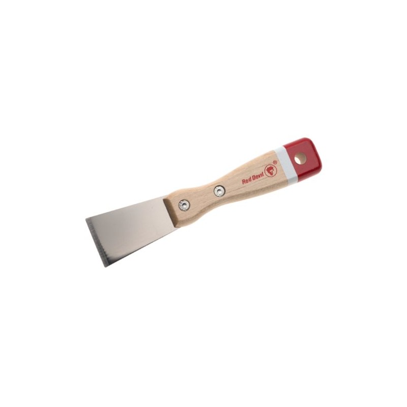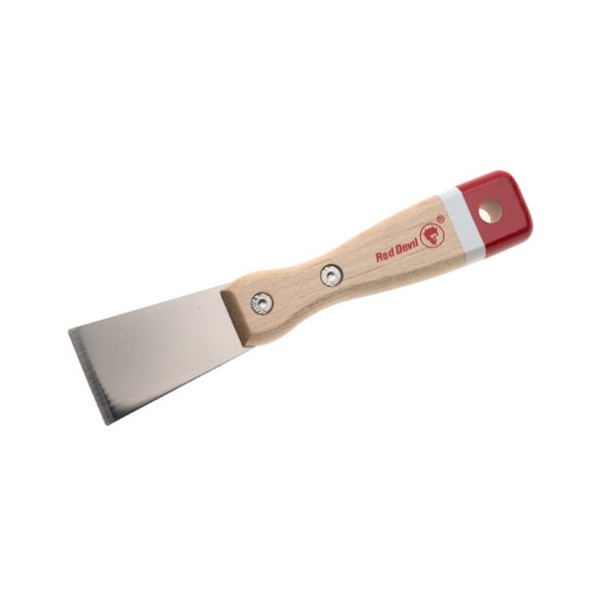 Red Devil's 1-1/2-inch Tuf-Job Scraper has an extra long, solid hardwood handle shaped for easier gripping and comfort. Its polished, high-carbon steel ground blade is strong, flexible, and durable. Mirror finishing and lacquer coating prevent rust and add life to the blade. The razor-ground edge makes tough scraping easy.