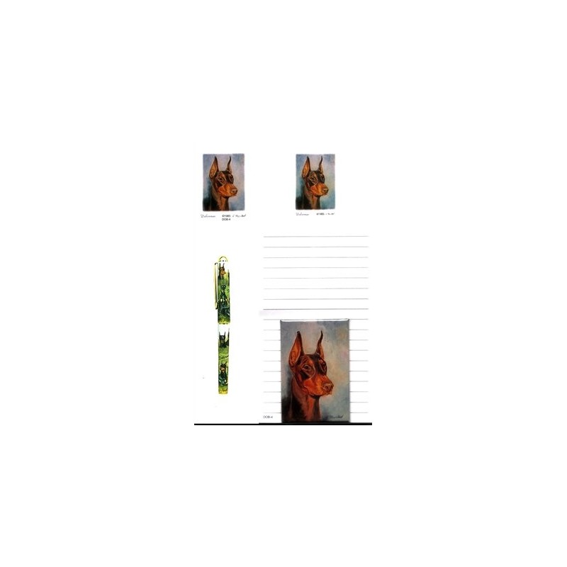 Renowned dog artist, Ruth Maystead, has created this wonderful gift set exclusively for us. Each set includes a notepad, a magnetic list pad, a roller ink pen and a magnet perfect for the refrigerator. All items in the set feature beautiful renderings of Dobermans. Makes a terrific hostess gift or stocking stuffer.*Note pad measures 6" x 8.5"*List pad measures 3.75" x 8.5"*Magnet measures 2" x 3"*Printed in the USA