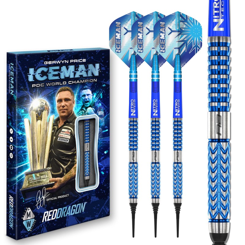 RED DRAGON Darts - Professional Player - Gerwyn Price Iceman Glacier - 90% Tungsten - 18g Barrel / 20g Full Weight Soft Tip Dart Set with Dart Flights and Dart Shafts