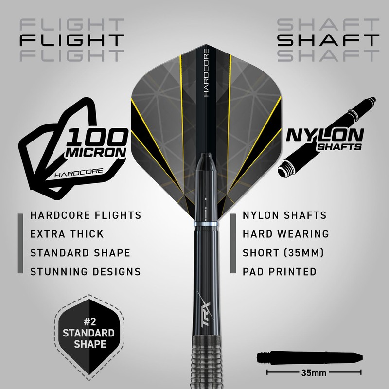 Experience improved aerodynamics with flights and shafts that ensure a smooth, stable trajectory. Each dart is equipped with extra-thick hardcore premium flights and TRX polymer shafts - a combination that increases stability and guarantees maximum precision throw after cast.