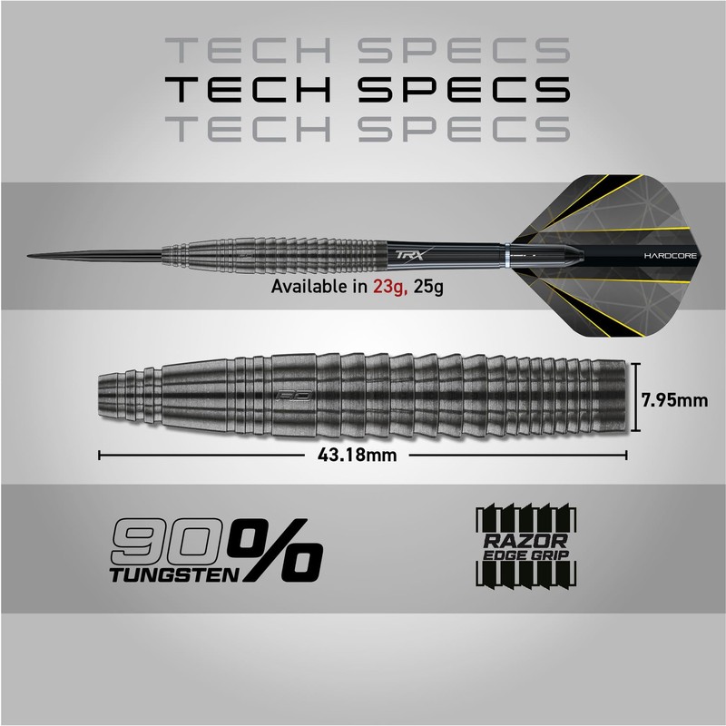 Experience improved aerodynamics with flights and shafts that ensure a smooth, stable trajectory. Each dart is equipped with extra-thick hardcore premium flights and TRX polymer shafts - a combination that increases stability and guarantees maximum precision throw after cast.