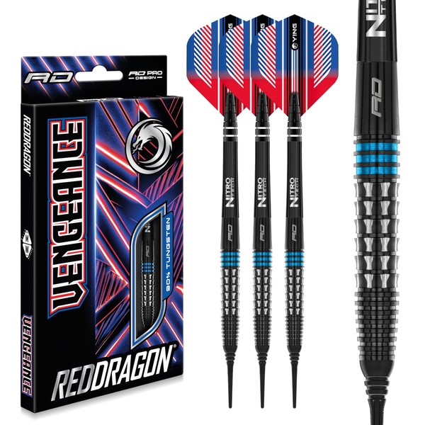 RED DRAGON Vengeance Blue 20 Gram Premium Tungsten Softip Darts Set with Flights and Stems