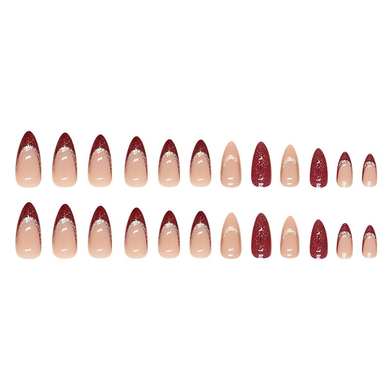Red French Tip Press on Nails Almond Medium Fake Nails with Designs Dark Red False Nails Glitter Gold Foil Gel Acrylic Nails Full Cover Glue on Nails Almond Shaped Stick on Nails for Women 24Pcs