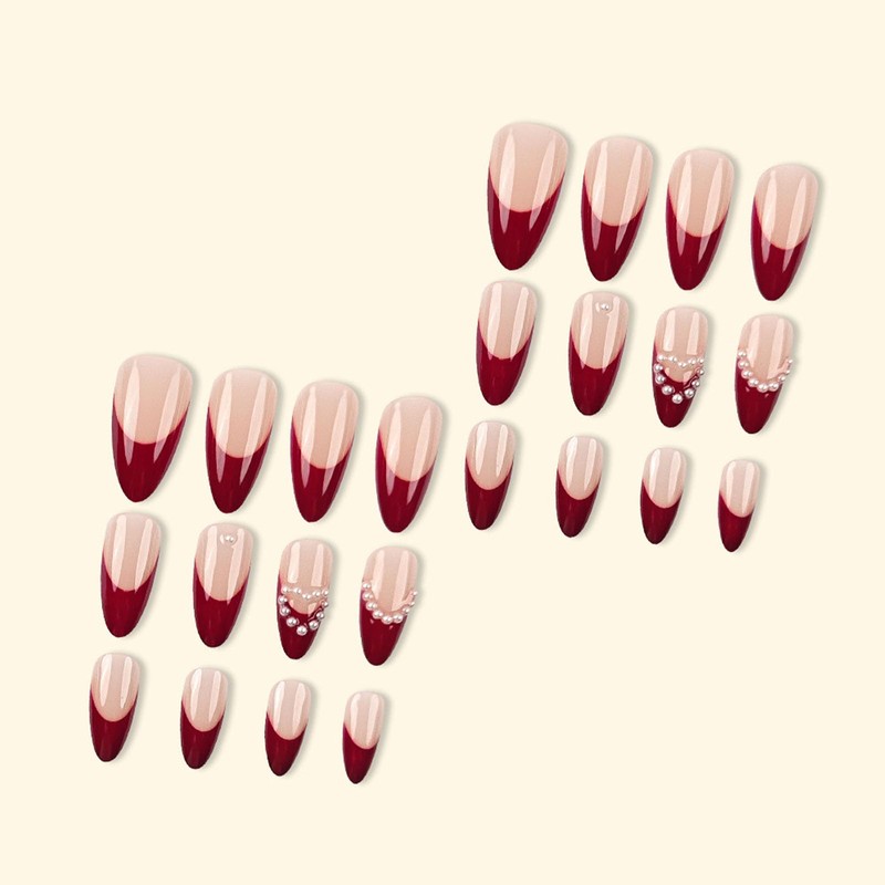 Red French Tip Press on Nails Medium Valentines Day Almond Fake Nails with Pearls Heart Design Simple Glue on Nails Press ons Glossy False Nails Nude Valentines Stick on Nails for Women 24 Pcs