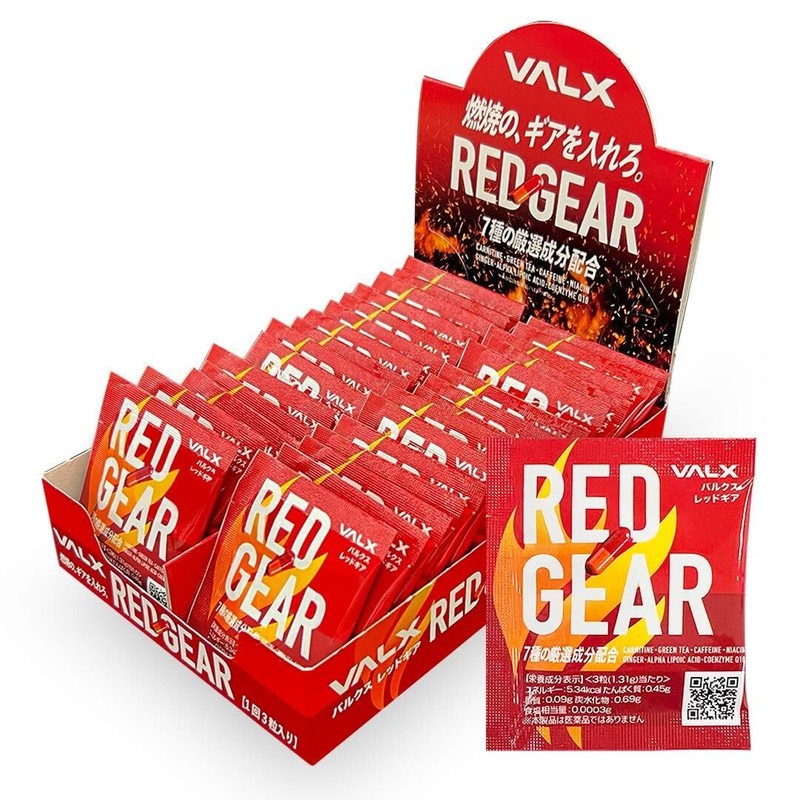 【累計1000万食突破!VALXこだわりのウォーキングサプリ】※ 「VALX RED GEAR(バルクス レッドギア)」は、山本義徳監修のもと、シェイプアップを目指す方をサポートする7つのこだわり成分を贅沢配合。脂肪をエネルギーに変えるサポートをします。安心・安全な成分を使用するだけでなく、豊富な配合を実現しました。運動する方だけでなく運動しない方にもRED GEARで、理想のカラダ作りを追求するための毎日の新習慣をご提供いたします。 ※2021年2月1日〜2024年3月31日 自社調べ 【おすすめのお召し上がり方】 ・通勤通学で歩く15〜30分前にお飲みください。 ・トレーニングの15〜30分前にお飲みください。 ・日中、体を動かす作業などがある際にお飲みください。 1日6カプセル程度、1回あたり3カプセルを目安に水などと一緒にお召し上がりください。 日本人は諸外国と比べて、歩く量が非常に多いと言われております。 日々の歩く時間の燃焼効果を効率的に高めることで、理想の体作りをサポートします。 【こんな方におすすめ】 ・脂肪が気になる方へ ・忙しくてなかなかトレーニングできない方へ ・食事や運動に気を遣う余裕のない方へ ・生活習慣に危機感のある方へ ・トレーニングを効率化したい方へ ・合理的/効率的に理想の体に近づきたい方へ 【人間の脂肪燃焼メカニズムをご存知ですか?】 実は、人間が脂肪を燃焼してエネルギーに変えるには、必ず4つのプロセスを経る必要があります。 ①リパーゼという酵素が脂肪を分解して、脂肪酸を分離させます。 ②脂肪酸が血管を通って、カラダ中に運ばれます。 ③脂肪酸がカルニチンと結合することで、細胞内のミトコンドリアに取り込まれます。 ④細胞内でコエンザイムQ10やαGPCが触媒として用いられ、脂肪酸が燃焼してエネルギーに変わります。 中でも重要なのが、L-カルニチンで、これがないとせっかく分解された脂肪が燃焼されずに、再び脂肪としてカラダに蓄えられてしまいます。 【成分量への特別なこだわり】 ※1日6カプセル当たり <分解サポート2成分> ・緑茶カテキン 500mg(ペットボトルのお茶約1本分) ・天然カフェイン 200mg (コーヒー約2.5杯分) <運搬サポート2成分> ・ジンジャーエキス 60mg ・ナイアシン 100mg (鶏ささみ約10本分) <燃焼サポート3成分> ・L-カルニチン 400mg (鶏胸肉約2枚分) ・コエンザイムQ10 60mg(イワシ約15匹分) ・αリポ酸 60mg(ほうれん草約1束分)