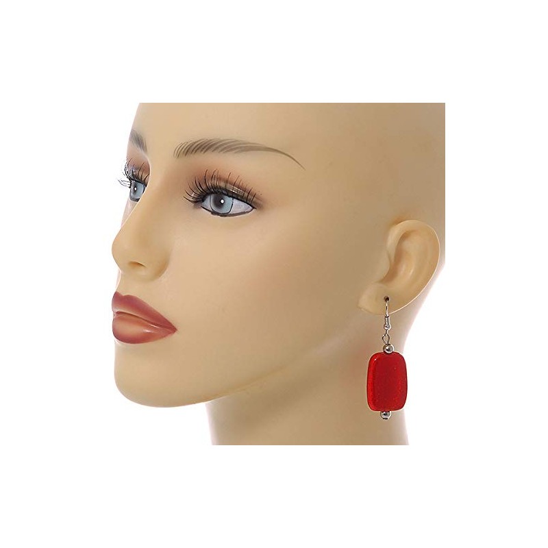 Red Glass Square Drop Earrings with Silver Tone Closure - 55mm L