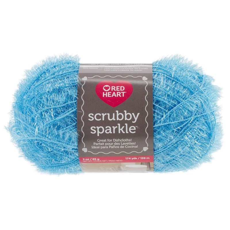 - Red Heart-Scrubby Sparkle Yarn. A uniquely textured yarn with a sparkle effect great for making pan scrubbies but also great for making crafty items. Weight category: 4. Content: 100% polyester. Put-up: 3oz/85g, 174yds/159m. Gauge: 18sX24r = 4in/10cm on size US8/5mm knitting needles. Crochet: 14scX13r = 4in/10cm with size I-9/5. 5mm crochet hook. Dyelotted: we try but are not always able to match dye lots. Care: machine was cold gently cycle, tumble dry, do not bleach or iron, dry clean with P solvents only. Comes in a variety of colors. Each sold separately. Imported
