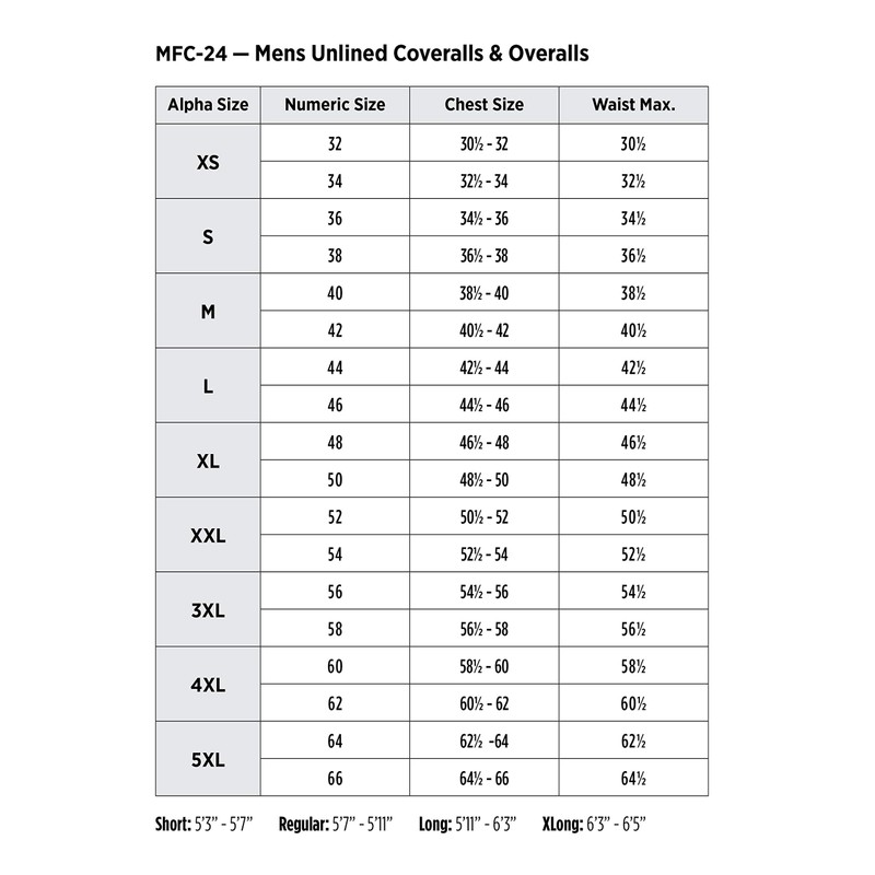 - Sizing: Do Not select your size according to your standard pant size. Measure both your chest (across its widest point) and your waist (at your belly button). Take the larger of these 2 measurements and select the corresponding coverall size from the size chart provided with product images. Height : Regular - 5'7 - 5'11 / Long or Tall - 5'11" - 6'3"