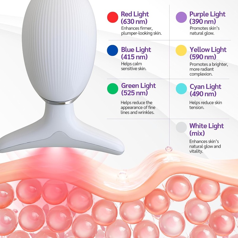 7-in-1 LED Light Therapy – Combines 7 therapeutic light colors (Red, Blue, Green, Yellow, Cyan, Purple, White) to target fine lines, wrinkles, acne, dullness, and uneven skin tone.