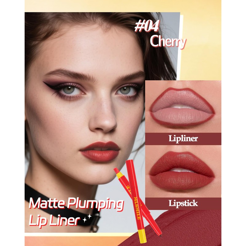 Red Lip Liner Matte 2 in 1, Plump Lipliner, Long-Lasting Creamy Formula, with Silicone Smudger for Sculpting Lip & Define Contours, Waterproof Non-staining Crayon Lip Liner Pencil 04 Cherry