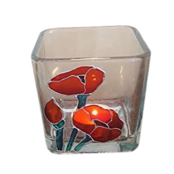 Red Poppy Flower Hand Painted Stained Glass Square Candle Holder