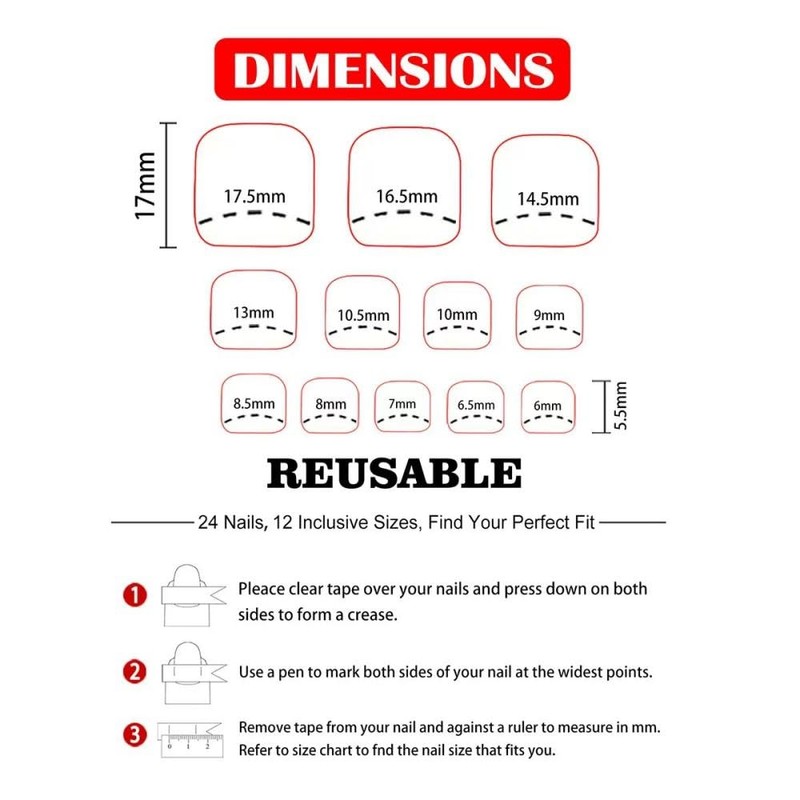 - Easy to Use:The full cover acrylic toenails are easy to trim. It only takes 5 minutes to get your favorite press on toes. Clean and polish your toenail, select a right size of the reusable stick on toe nails, apply the glue to the back of the nail then press it on your nail for 20 seconds,you get a pretty toenails