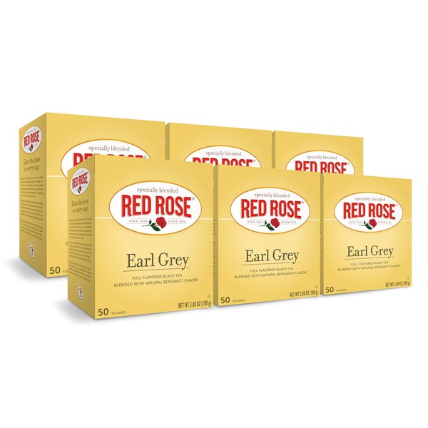 Red Rose Earl Grey Tea Full Flavored Black Tea Specially Blended Strong Black Tea with 50 Individually Wrapped Tea Bags Per Box (Pack of 6) Contains Caffeine Brew Hot/Cold Original Black Tea