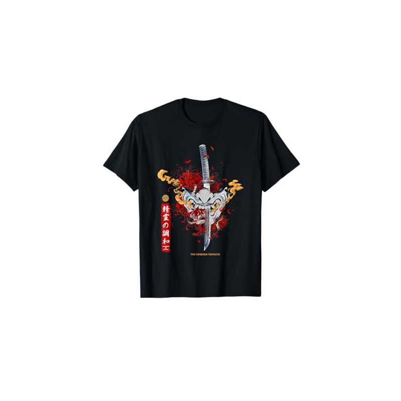 Red Spider Lily and Japanese Anime Retro Oni Samurai Mask T-Shirt