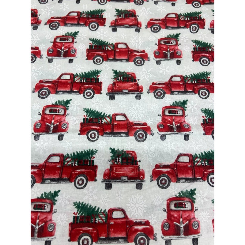 Red Truck Christmas Pine Tree Snowflake 100% Cotton Fabric By The Half Yard