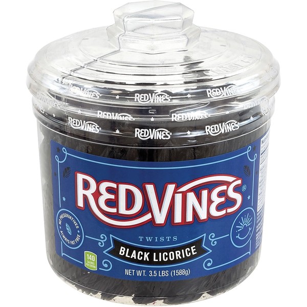 Live every day on the sweet side with Red Vines Black Licorice Twists. Bite into the bold and classic flavor of black licorice with this timeless twist candy, made using artisanal techniques and easy to share in this fun knob- handled jar. Open a vintage-styled jar and join in a sweet moment of delicious treats with a loved one any time. Great for office desks and kitchen counters alike, set out a jar for all to experience this satisfying snack. These black licorice twists are a fat-free, preservative-free, and kosher candy. Perfect for black licorice lovers, this pack includes one jar filled with four pounds of twists.