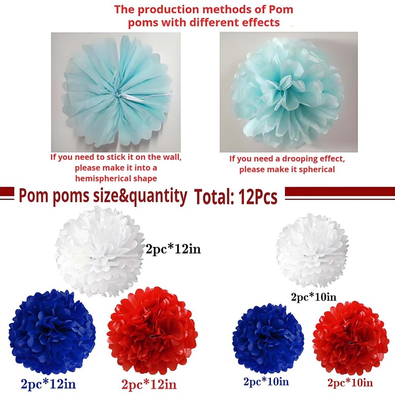Red White and Blue Tissue Paper Pom Poms 12Pcs- Hanging Paper Flowers for Wedding Birthday Graduations Christmas and Special Occasions(8 &10 & 12 inch)