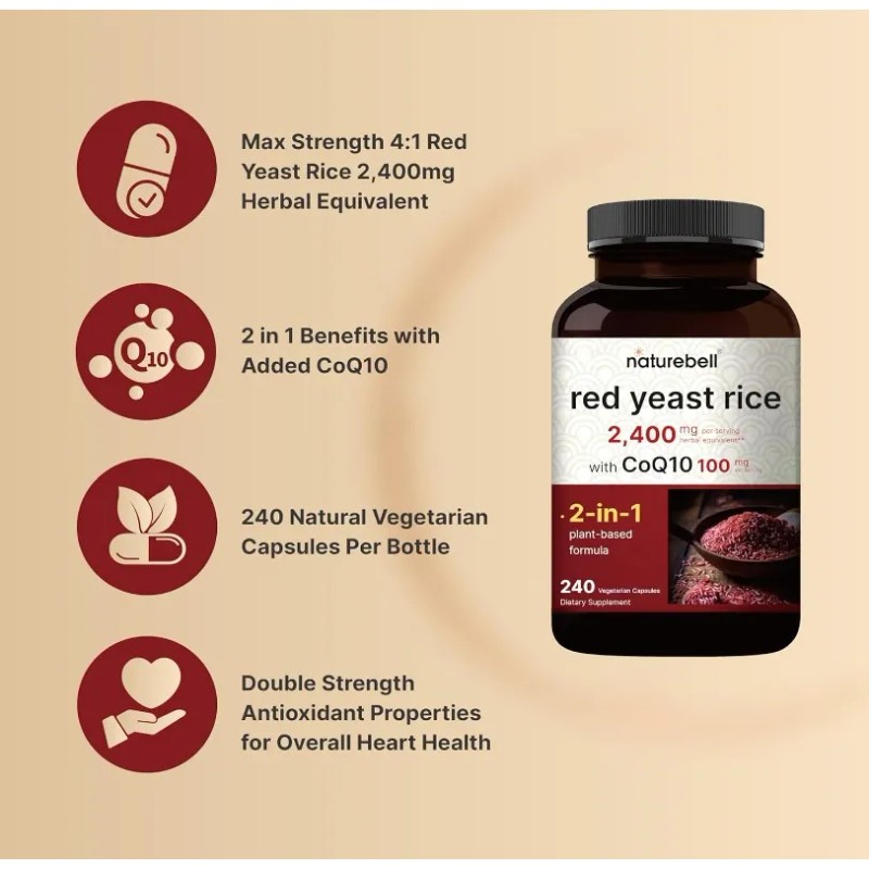 🌟 CoQ10 apoya tu salud celular, mientras que el arroz de levadura roja ayuda a mantener niveles saludables de colesterol, ¡de forma natural y segura!