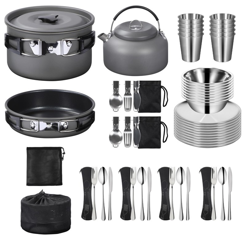 REDCAMP 39pcs Camp Cookware & Mess Kit Set for 4, Non-Stick 1.8L Pot, 7" Pan, 1.4L Kettle, 6X Stainless Steel Plates Cups, 4X Bowls Forks Spoons Knives - Lightweight for Camping, Backpacking, Hiking