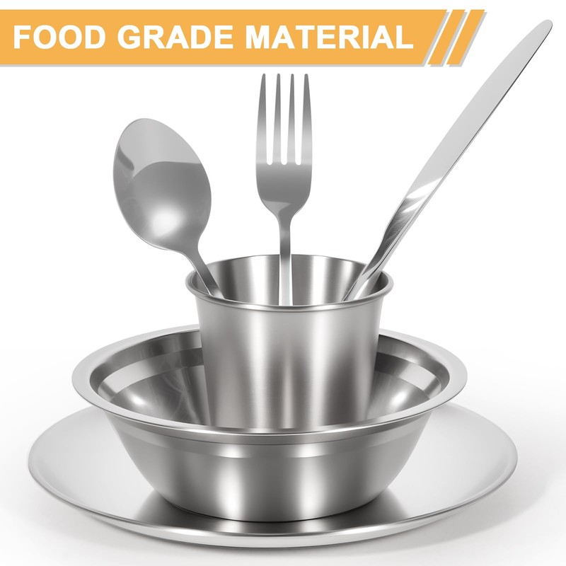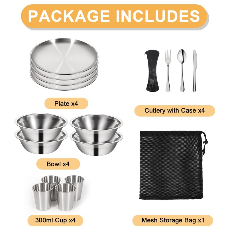 - Complete 4-Person Set: This camping mess kit includes everything you need for 4 people. There are 6 plates, 4 bowls, 6 300ml cups, 4 spoons, 4 forks, 4 knives, 4 cutlery cases, and 2 mesh bag. It's a great choice for family dinners or small gatherings.