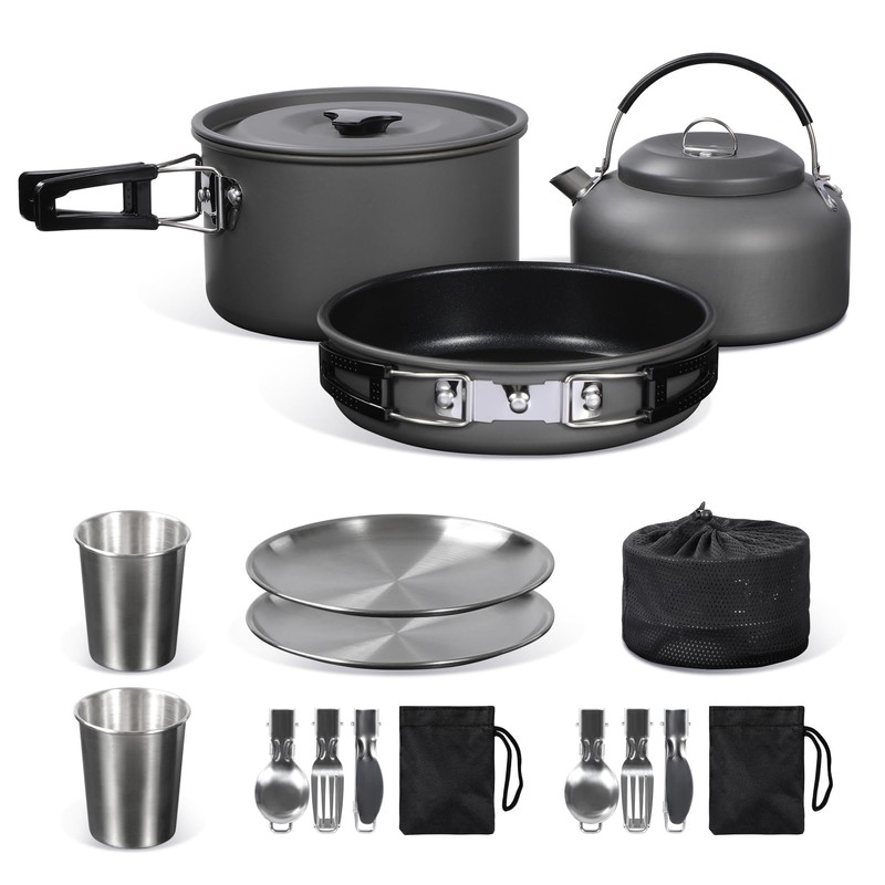- Portable and Compact: Designed for on-the-go lifestyles, this camping cookware set is lightweight and easy to carry. All the pieces can be neatly stored in the included mesh bag, making it convenient to take with you wherever you go. It won't take up much space in your bag.