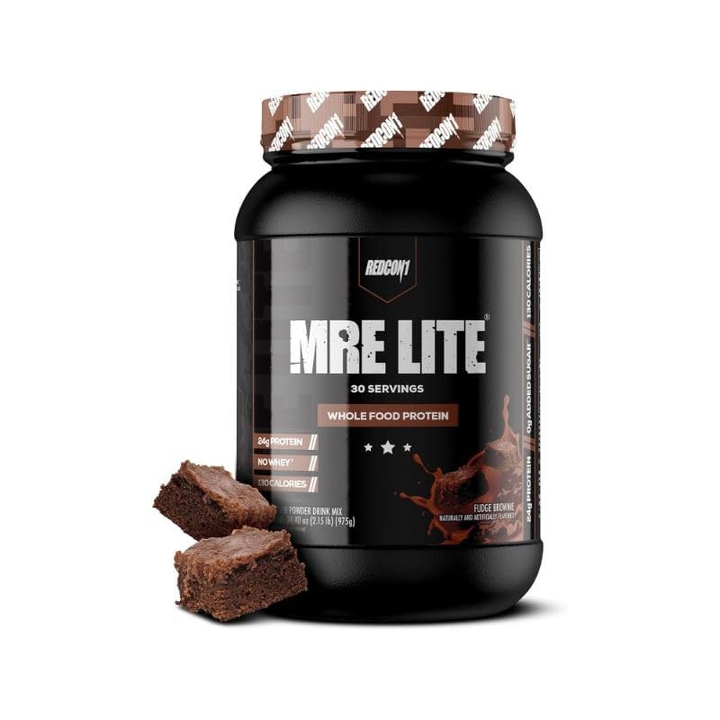 - Professional Grade Formula - REDCON1's MRE Lite whole food high protein shakes contain a whole food protein blend of beef, salmon, chicken, egg, brown rice and pea protein powders. Each meal replacement shake is just 130 calories with 24g of protein and just 2g of sugar in this motivational protein shake.