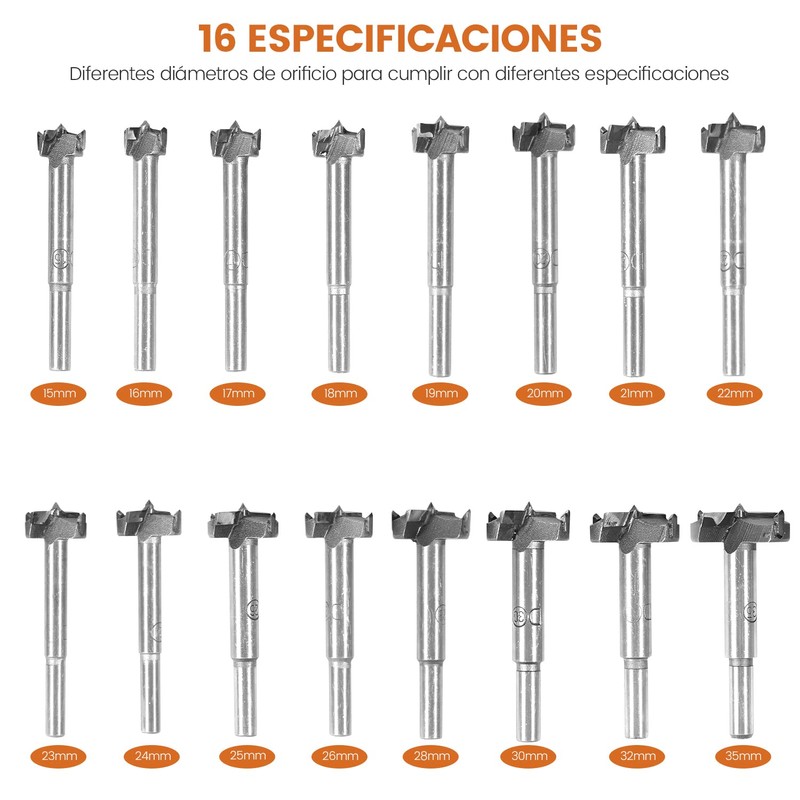 - 【16 piezas incluyen 16 diferentes diámetros de taladro】15 mm/16 mm/17 mm/18 mm/19 mm/20 mm/21 mm/22 mm/23 mm/24 mm/25 mm/26 mm/28 mm/30 mm/32 mm/35 mm.