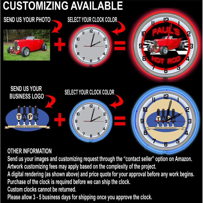 This brand new ready-to-hang neon clock makes a perfect addition to any garage, bar, game room or man cave! Clocks are lit with two double neon tubes, one color for the outside and one bright white on the inside. Clock motor contains a high-precision quartz movement and sweep technology making it smooth and quiet with no "tick-tock" noise. Inside image is a printed high quality graphic which can have words added to it upon request. Have an image or business logo you'd like to add to the clock? We can do customizing upon request. Whether you want a gift with a "wow factor" or compliment your own home/shop, our neon clocks will impress!