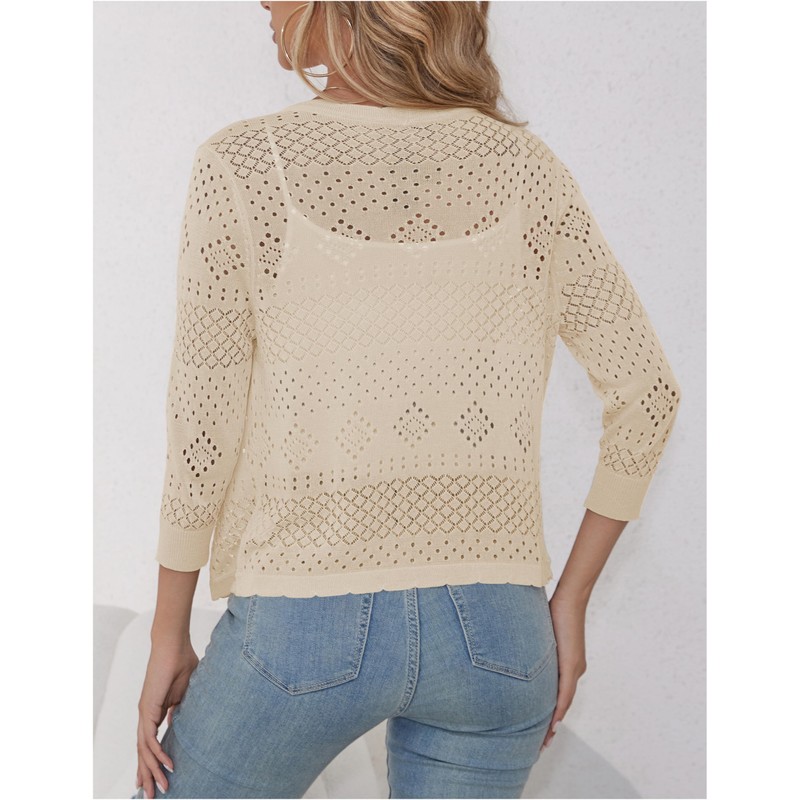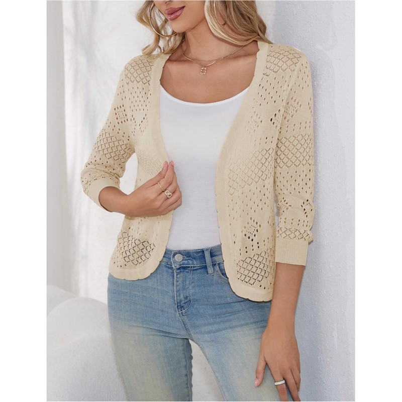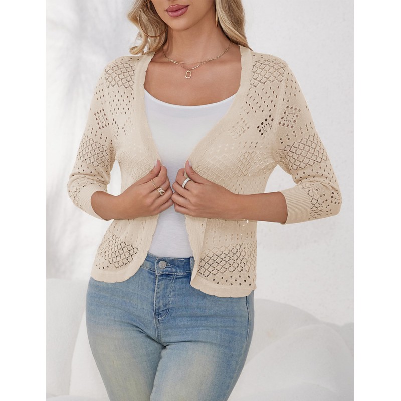REDHOTYPE Women's 3/4 Sleeve Cardigan Open Front Cropped Shrugs Summer Hollowed Lightweight Cardigans Sweater,Apricot,Meduim