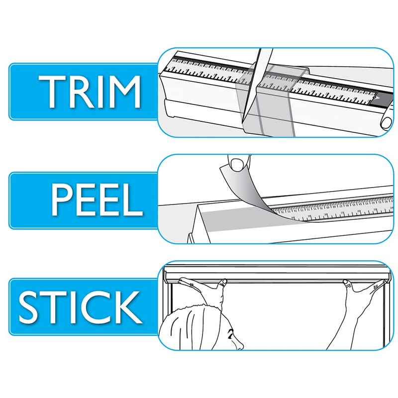 - Trim your shade with a straight-edged kitchen knife using included patented trimming scale and guide; then permanently install in seconds with Simple Stick No Tools peel-and-place application