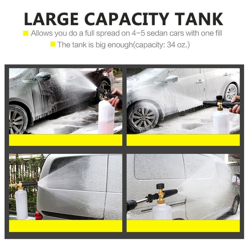 • Capacity of bottle: 34 oz (1L). Connectors are made of quality brass. Big enough for you to do a full spread on 4-5 sedan cars with one fill.