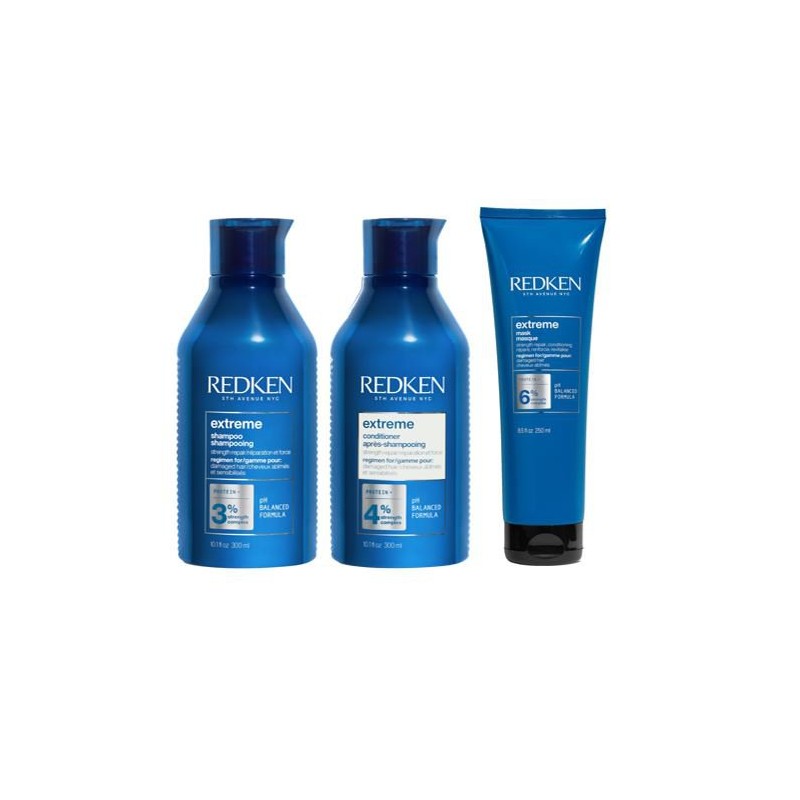 The Redken Extreme Strengthening Trio Bundle includes Redken Extreme Strengthening Shampoo, Redken Extreme Strengthening Conditioner, and Redken Extreme Megamask, all designed to cleanse, strengthen, and restore damaged hair while preventing future hair breakage.