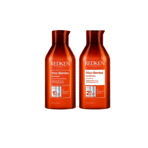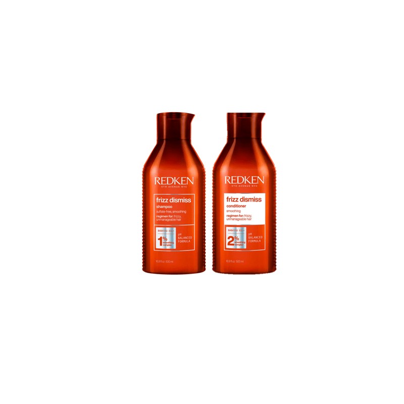 The Redken Frizz Dismiss Shampoo and Conditioner 500ml Bundle includes a sulfate and sodium chloride-free anti-frizz shampoo and conditioner formulated with Redken's Smoothing Complex featuring sustainably sourced Babassu oil to tame frizzy hair, increase smoothness, and enhance shine.
