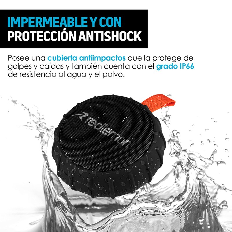 - IMPERMEABLE Y CON PROTECCIÓN ANTISHOCK: Ideal para actividades extremas, musicalizar rodadas o ir de campamento. Posee una cubierta antiimpactos que la protege de golpes y caídas y también cuenta con el grado IP66 de resistencia al agua y el polvo