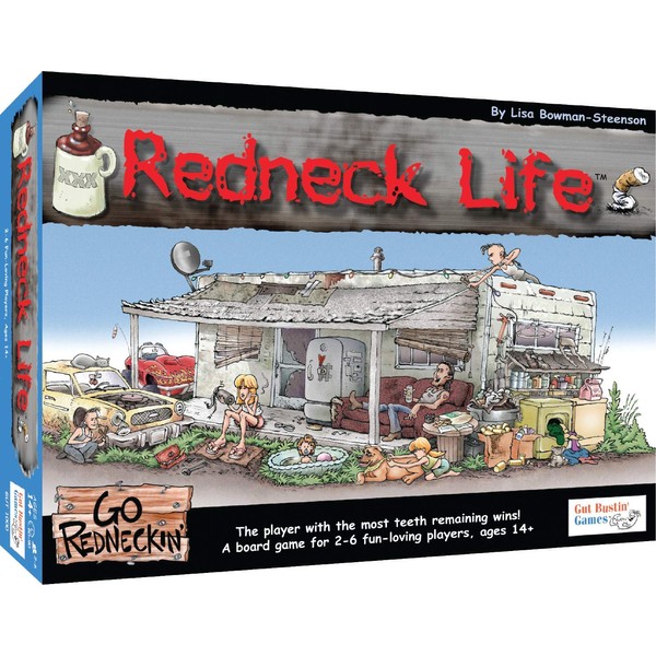 Step into the world of redneck life with "The Game of Redneck Life" where a roll of 2 dice determines the grade you complete in school, which sets you up for one of 11 fabulous careers, such as Mullet Salon Operator or Monster Truck Announcer! Journey through Blue Collar Americana using credit to buy vehicles, get married, purchase a home, get divorced, remarried, and raise a passel of young 'uns. Through accidents and brawls, players lose teeth during the game. Buy some back if you can, as the player with the most teeth at the end of the game wins!
