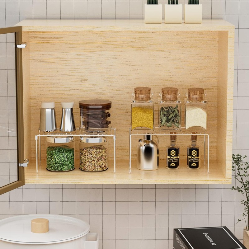 - Space Saving ---- This set of 2-pack cabinet shelves can not only organize kitchen spice jars, cans, and dishware, but also suit for cabinet, cupboard, pantry, bathroom, office etc. With our countertop organizers, you can put small things that are not easy to arrange. It is more widely used than other counter shelf on the market.