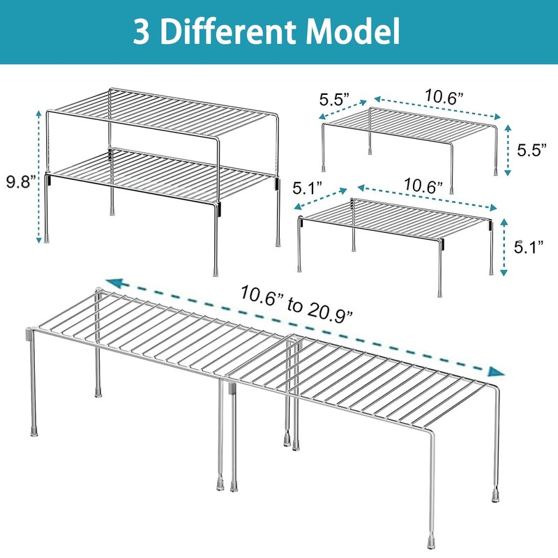 - Stackable Shelf Rack ---- The product comes with two sets of cabinet shelves where you can stack one on top of another. The two-tier design of this product allows you to store dinnerware under, in between or on the rack, which is perfect to use as a storage organizer in kitchen, bathroom, cabinet, wardrobe, pantry, cupboard and anywhere in your home or office for that wonderful extra storage space.