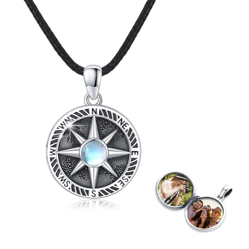 REDSUN Compass Locket Necklace 925 Sterling Silver Card Compass Moonstone Chain Photo Locket Amulet Medallion with Photo Compass Jewellery for Men Son Boys Women Gifts