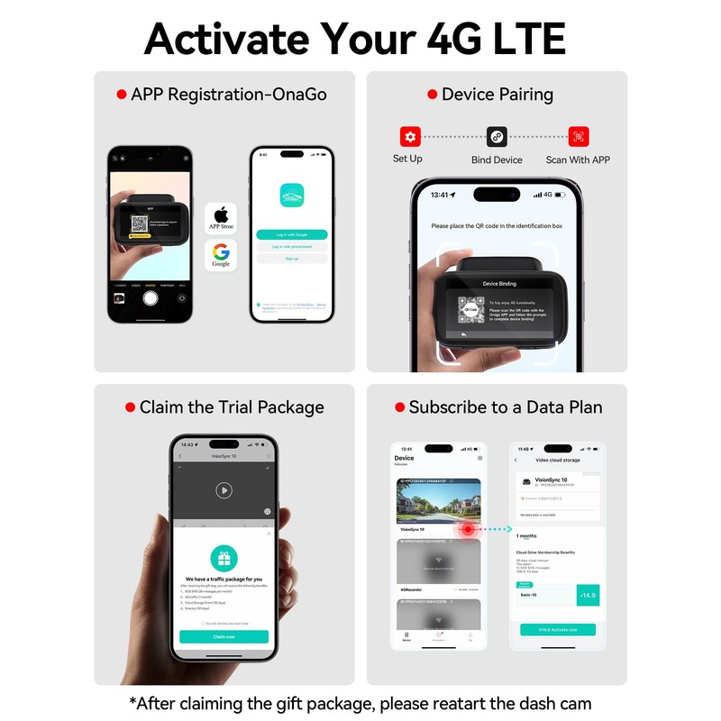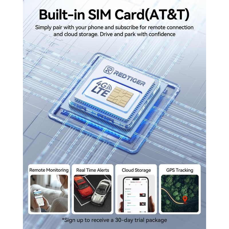 - [Reliable 4G LTE Remote Access*] REDTIGER VS10 features a built-in AT&T SIM card, providing seamless 4G LTE connectivity. Pair it with the OnaGo app to unlock live streaming, GPS tracking, instant collision alerts, and cloud storage. A complimentary trial is included to explore premium features. *Subscription required after the trial for continued access.